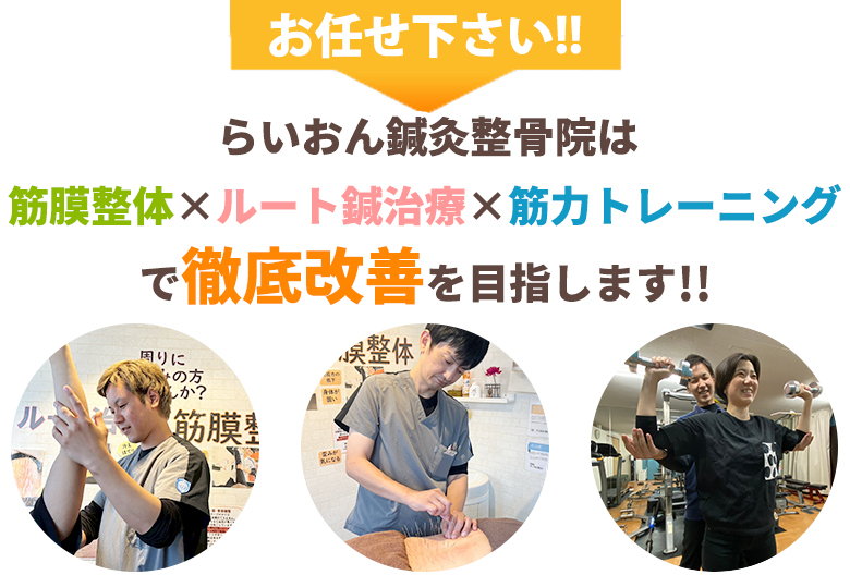 『筋骨格整体』や『ルート治療』で痛みを取り動きやすい体にして、姿勢や歩き方などの動作(運動機能)を『機能改善リハビリ』や『パーソナルトレーニング』で改善し健康な体作りをさせて頂きます。