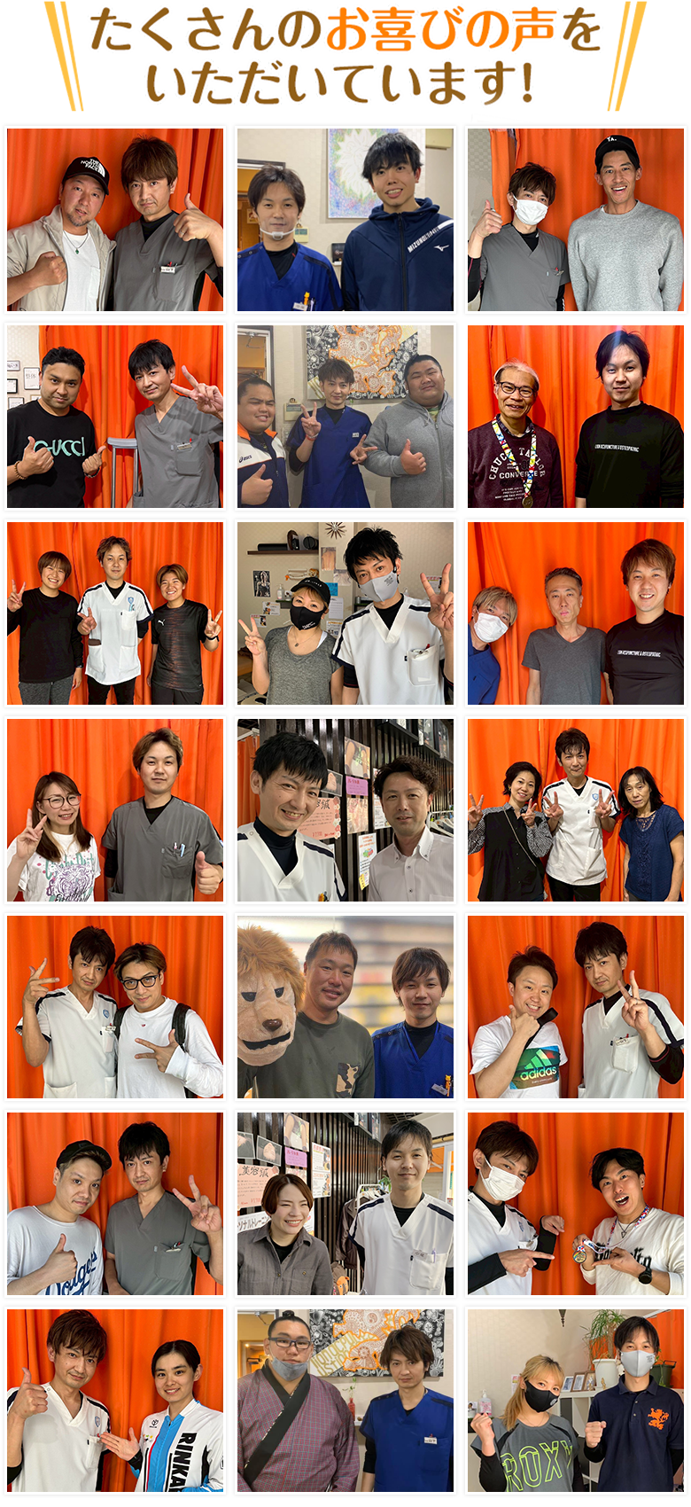 勤務スタッフ全員が国家資格保持者(はり師、きゅう師、柔道整復師)です。免許取得後も院内で研修会、勉強会を行い、院外の勉強会にも積極的に参加し、『他院より少しでもよい治療を!』をモットーに日々努力しております。他にも院外でのトレーナー活動にも力を入れております。